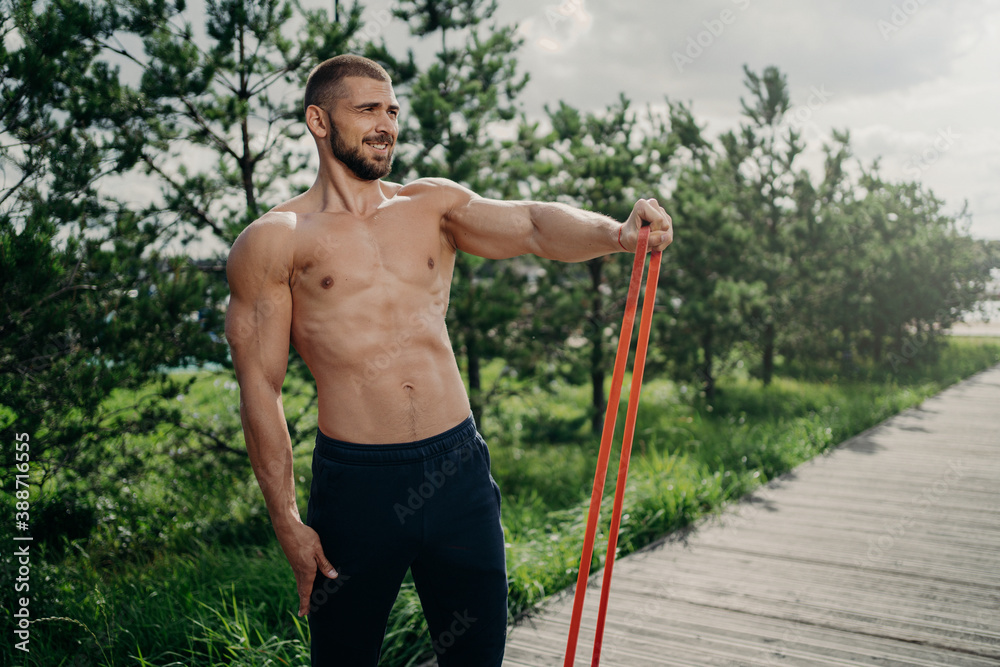 Strength And Motivation Concept Muscular Man With Naked Torso Has Exercises With Resistance is a popular picture for sexy and hot.