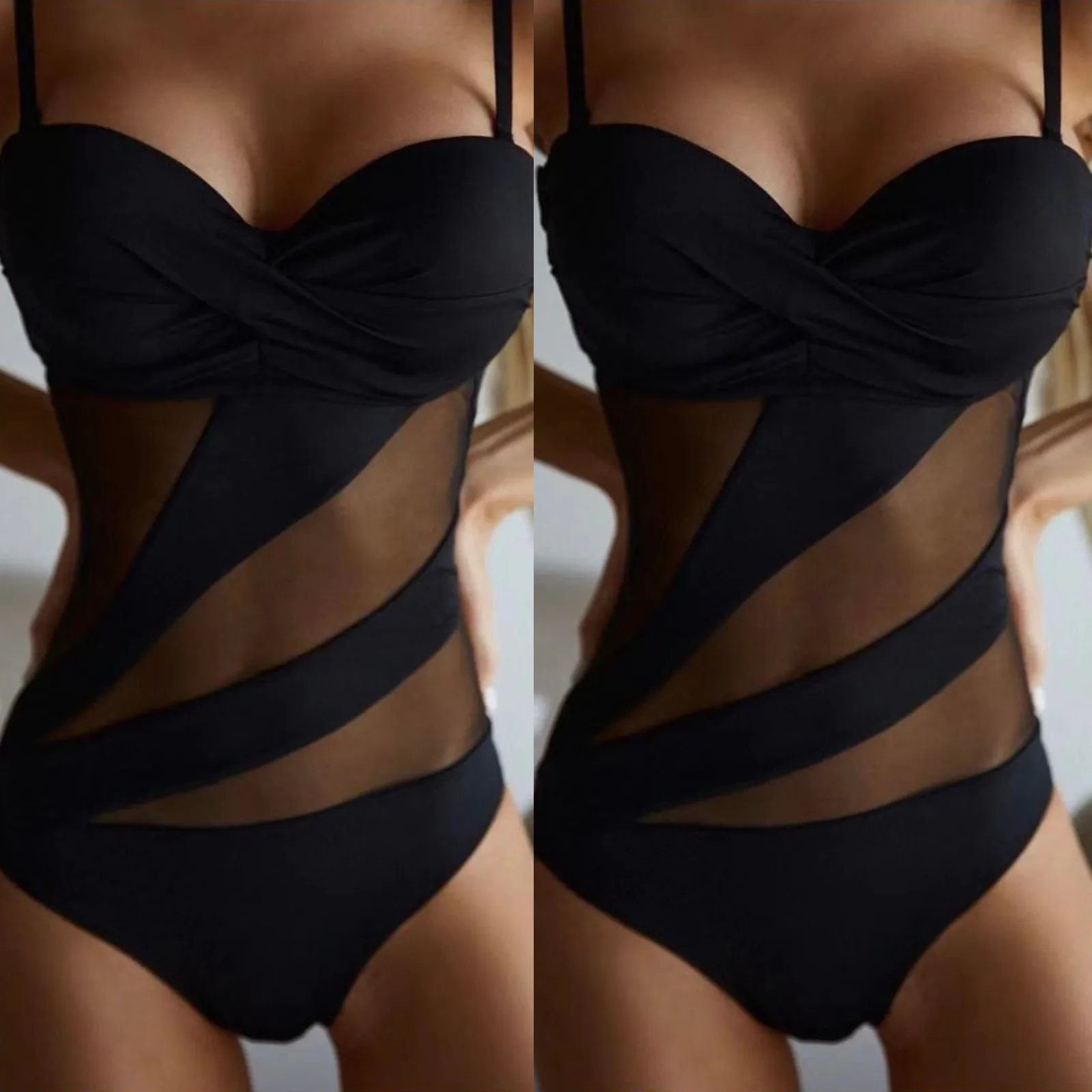 Summer Mesh Patchwork One Piece Swimwear For Women Double Straps Black Bikini Swimming Swimsuit is a popular picture for sexy and hot.