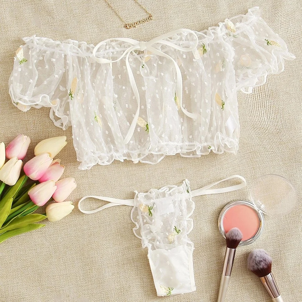 Tag : Super See Through Two Piece Embroidery Bra Thong Set Puffy Mesh Erotic Hot Sexy Girls Underwear