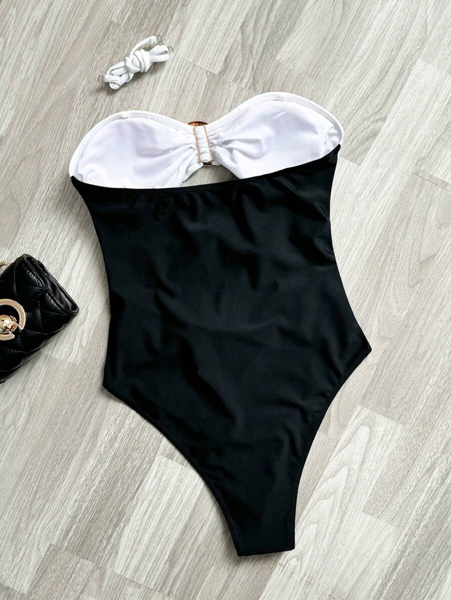 Swim Chiccia Women Beach Outfit Contrast Color Spaghetti Strap Hollow Out One Piece Bikini is a popular picture for sexy and hot.