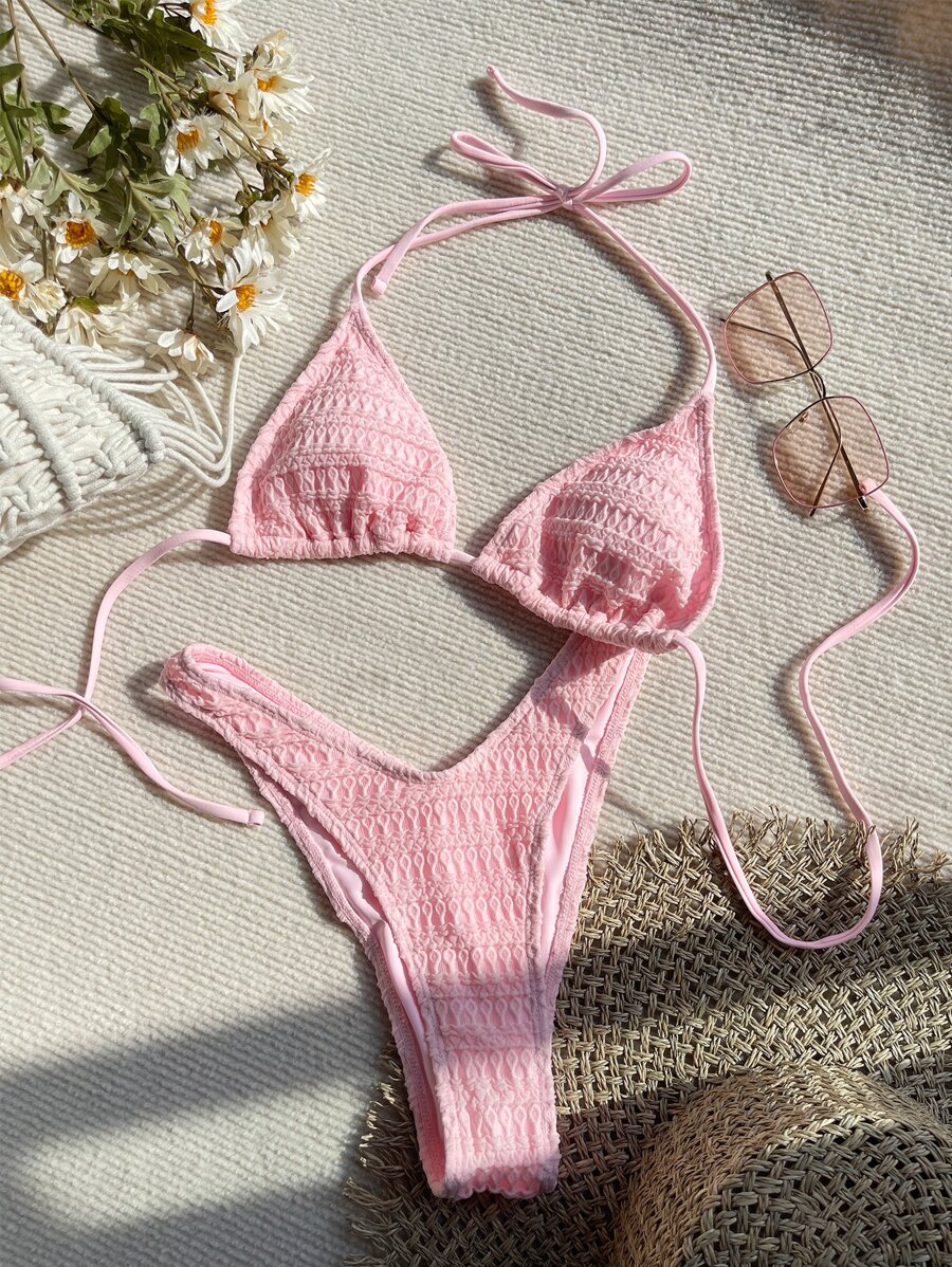 Tag : Swim Mod Summer Beach Textured Bikini Set Halter Triangle Bra Top High Cut Bikini Bottom 2