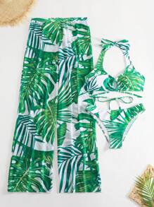 Swim Vcay Summer Beach Tropical Print Halter Bikini Set With Cover Up Pants SHEIN USA is a popular picture for sexy and hot.