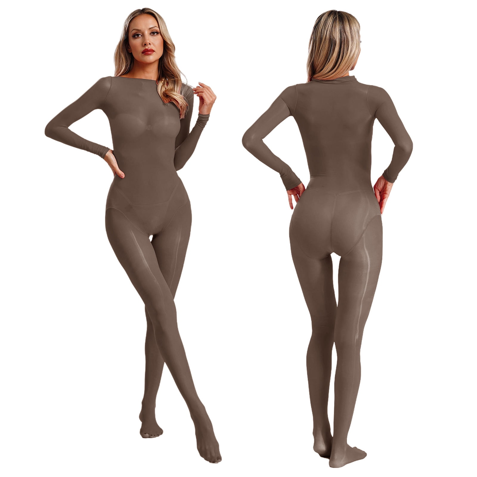 Tag : Sxiwei Women Oil Shiny Bodysuit Tights Catsuit Jumpsuit Glossy Leotards Lingerie Costumes Coffee