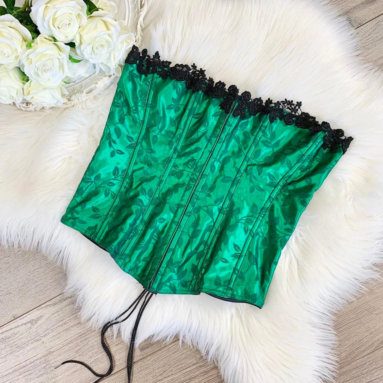 Tag : Sz 38 M L Vintage Empire Intimates Emerald Green Silky Vine Print Lingerie Corset Etsy
