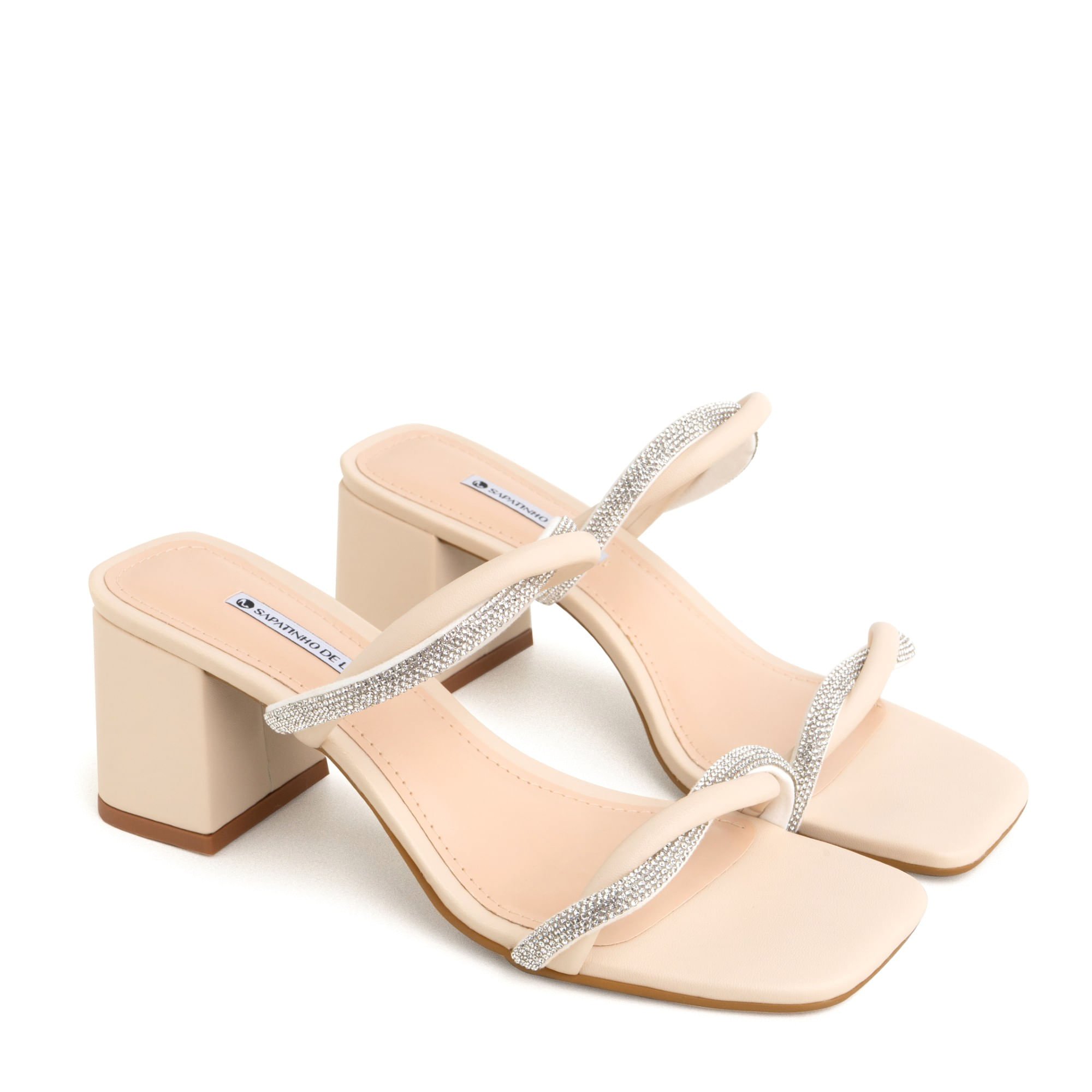 Tamanco Nude Manteiga Salto Bloco Duas Tiras Cruzadas Strass Brilho Nude Manteiga