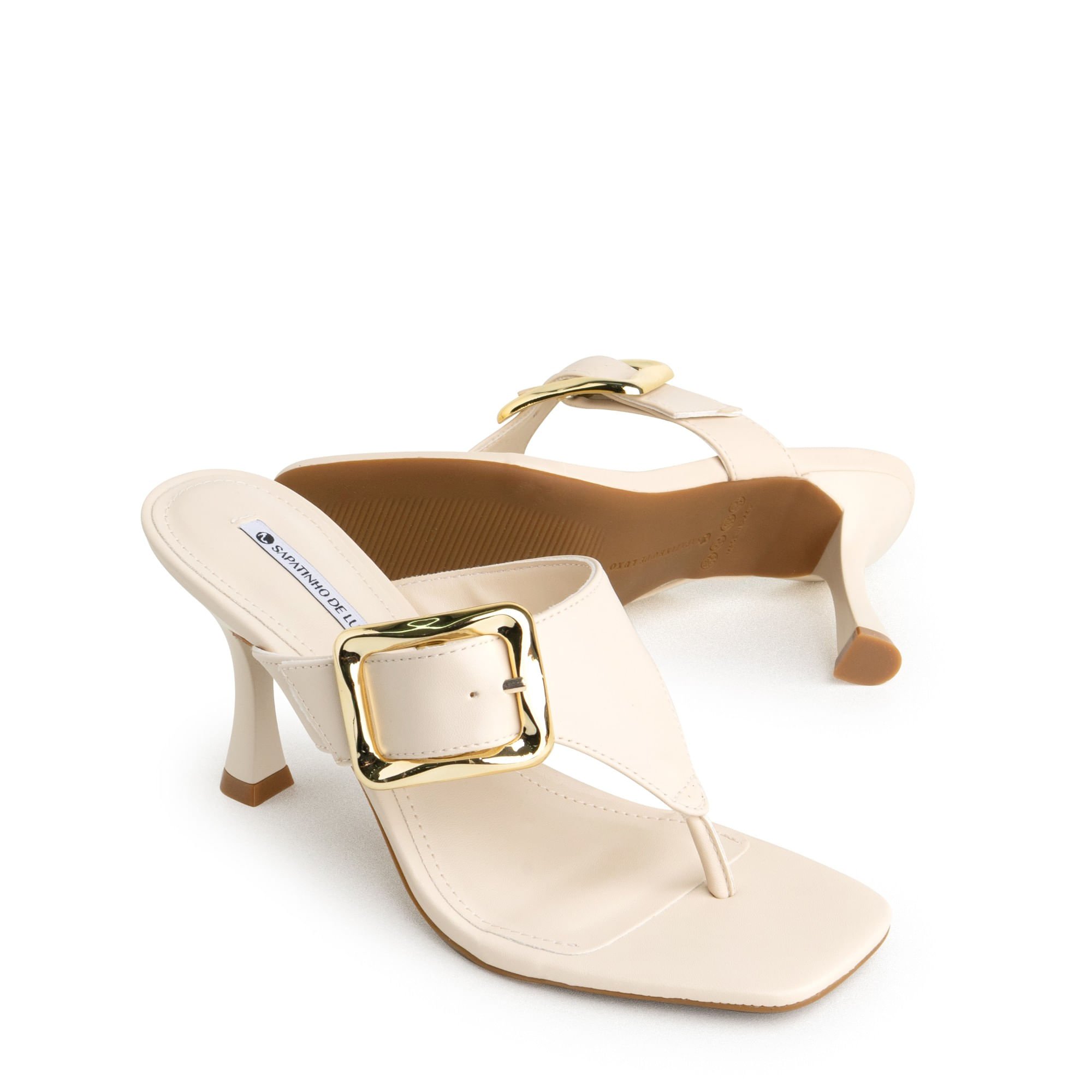 Tamanco Nude Manteiga Salto Taça Enfeite Fivela Ouro Bege Dourado 206118