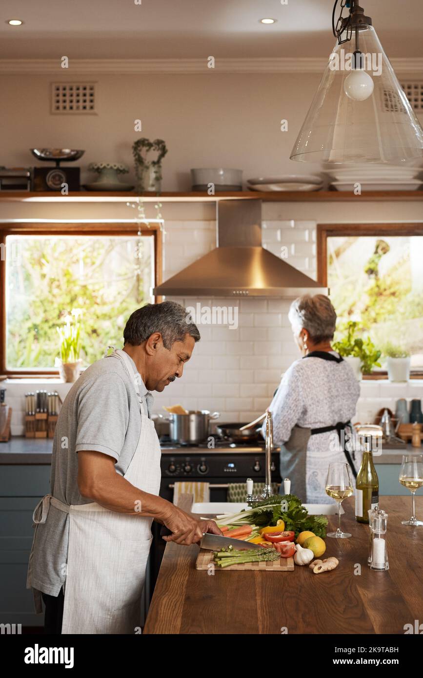 Tag : Teamwork Makes Dinner Work A Happy Mature Couple Cooking A Meal Together At Home Stock Photo