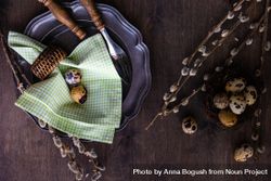 Tag : Top View Of Easter Table Setting With Quail Eggs And Pussy Willow And Checkered Green Napkin