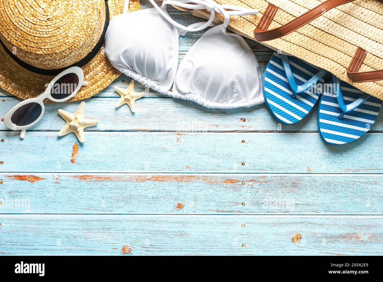 Tag : Top View Of Beach Bag Straw Hat Sunglasses Flip Flops And Bikini With Copy Space For Text On