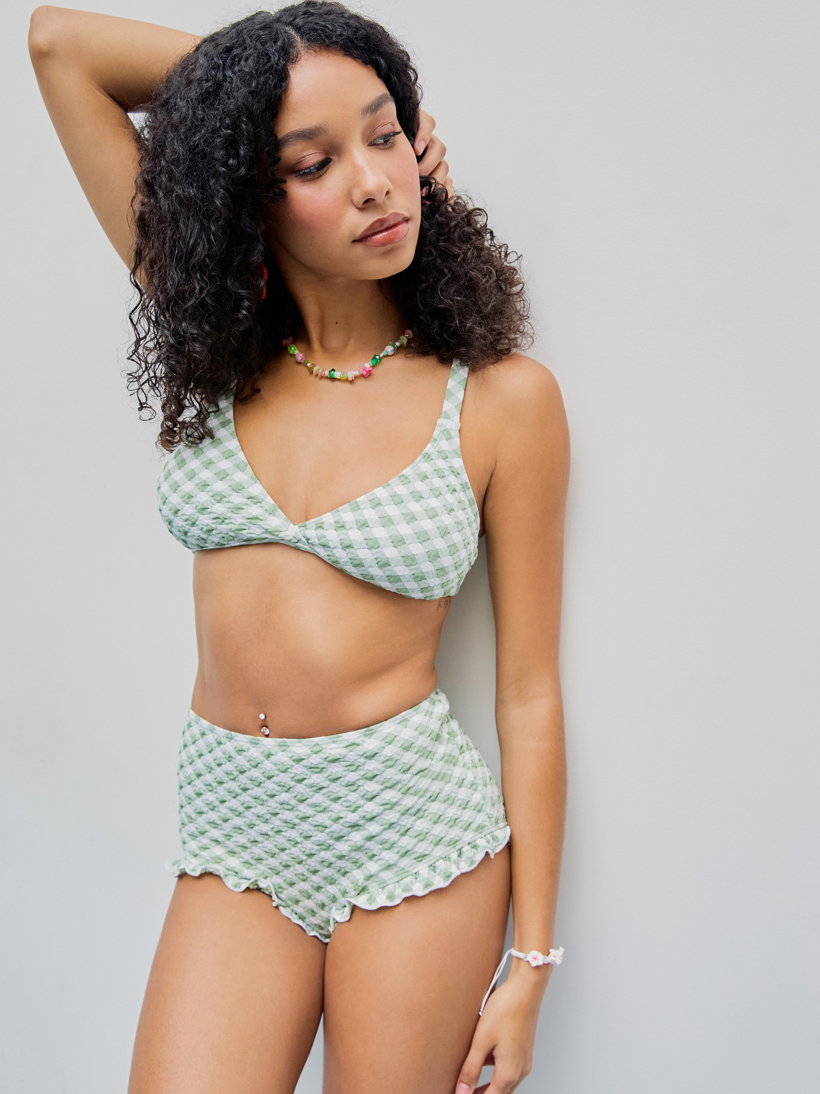 Tag : Tummy Control Knit Fabric Shaping V Neck Check Lettuce Trim Cheeky Bikini Set For Vacation