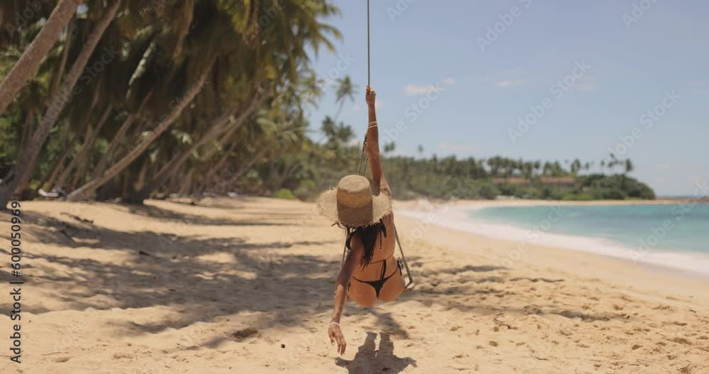Tag : Vidéo Stock Bikini Beach Girl in Black Swimsuit on Palm Tree Swing on Vacation Adobe Stock
