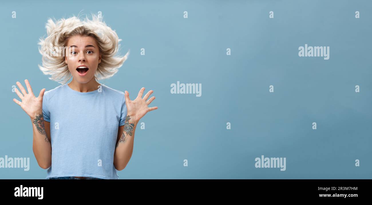 Waist Up Shot Of Impressed Surprised Attractive And Cute Girl With Blonde Hair Floating In Air 126712