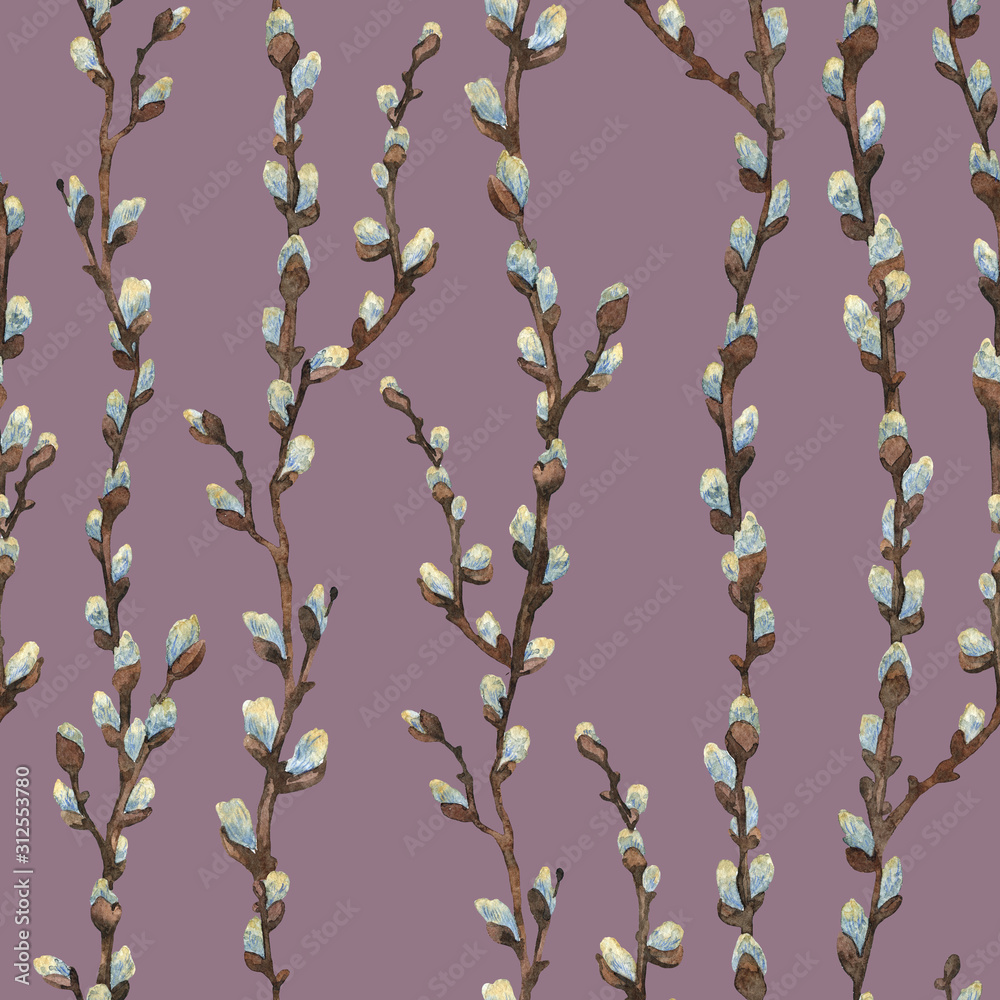Tag : Watercolor Pussy Willow Pattern Seamless Pattern With Willow Brunch On Pink Background Hand