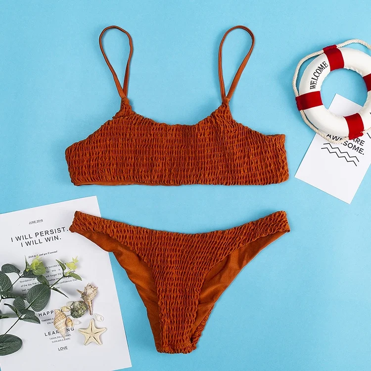Wholesale Solid Color Bikini Two Piece Bikini Women Shirred Glamour Sling High Cut Bikini Set 62868