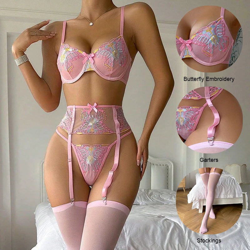 Women Sexy Butterfly Embroidered Bow Lingerie Set Femmes Pink Transparent Mesh Comfortable 4 is a popular picture for sexy and hot.