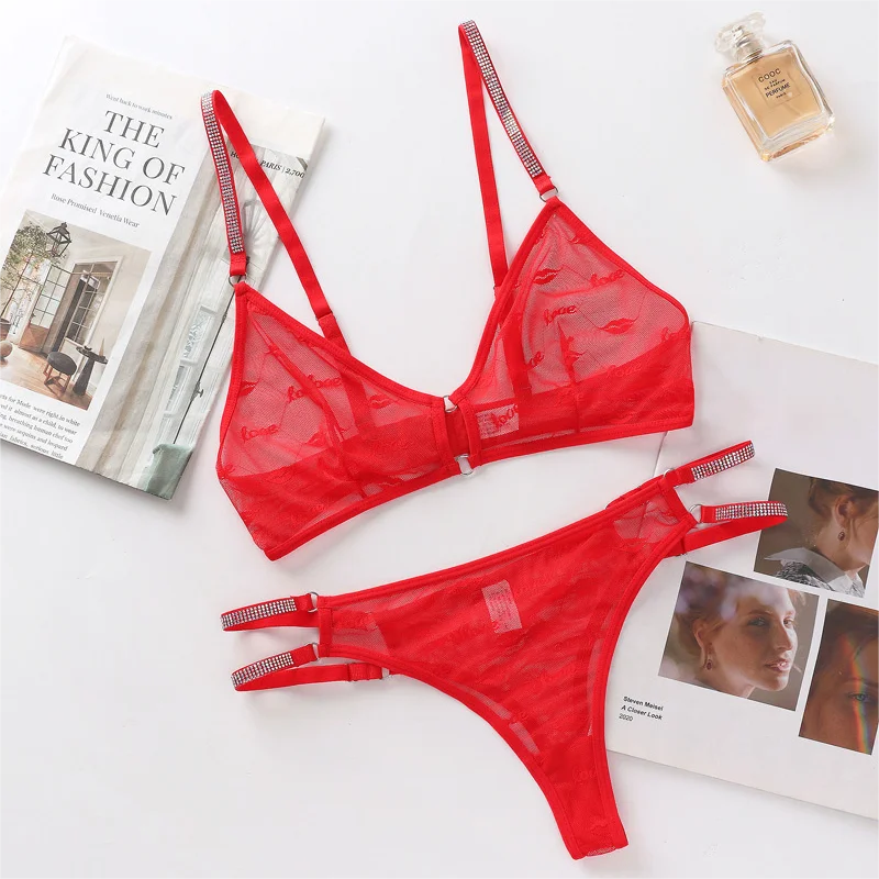 Women Sexy Lingerie Bra And T Back With Rhinestone Transparent Lace Nightwear G String Suit is a popular picture for sexy and hot.