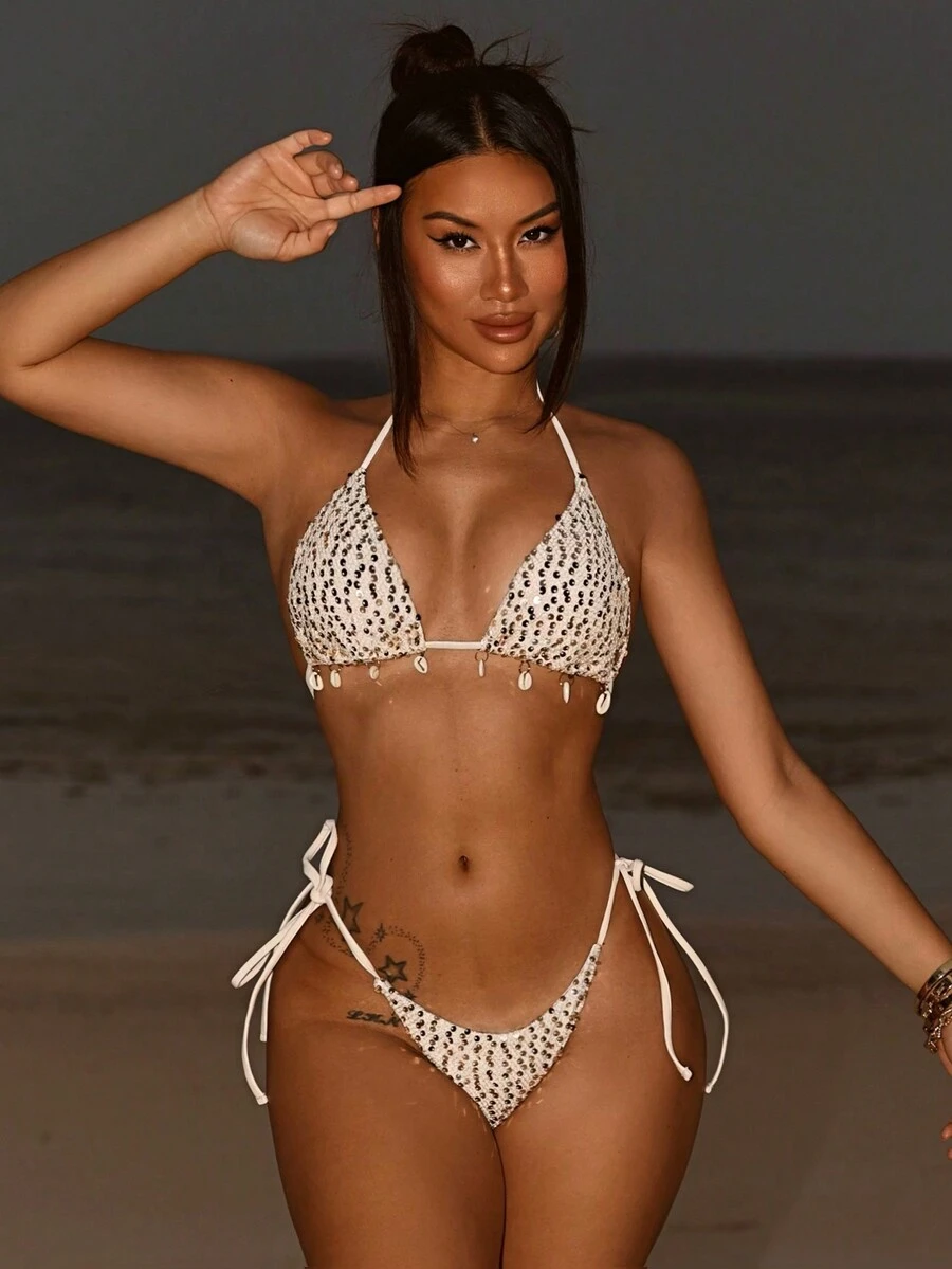 Women S Glittering Triangle Cup Separated Bikini Set With Seashell Decor Back Tie Summer Beach 178224