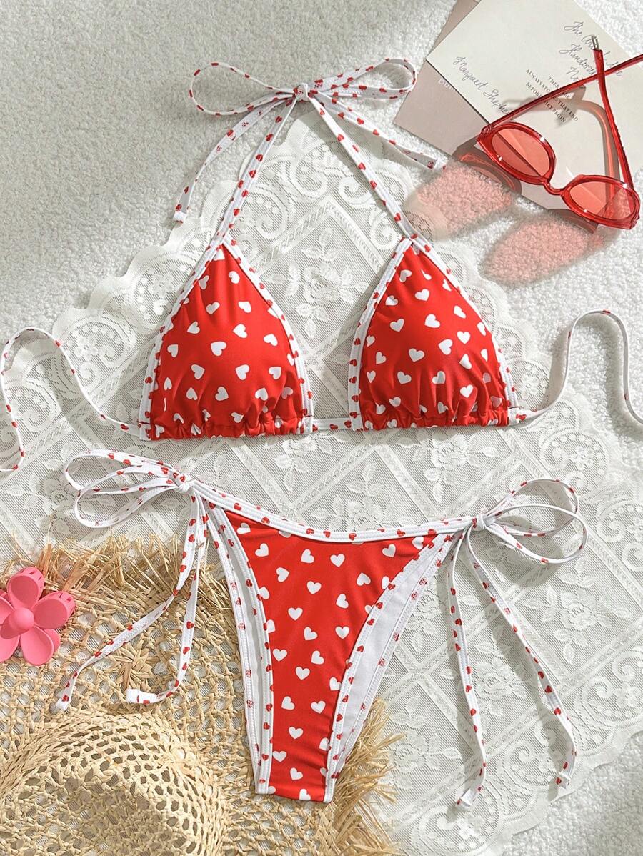 Women S Sexy Heart Print Halter Bra Bikini Bottom Red Bikini Set For Summer Beach SHEIN USA is a popular picture for sexy and hot.