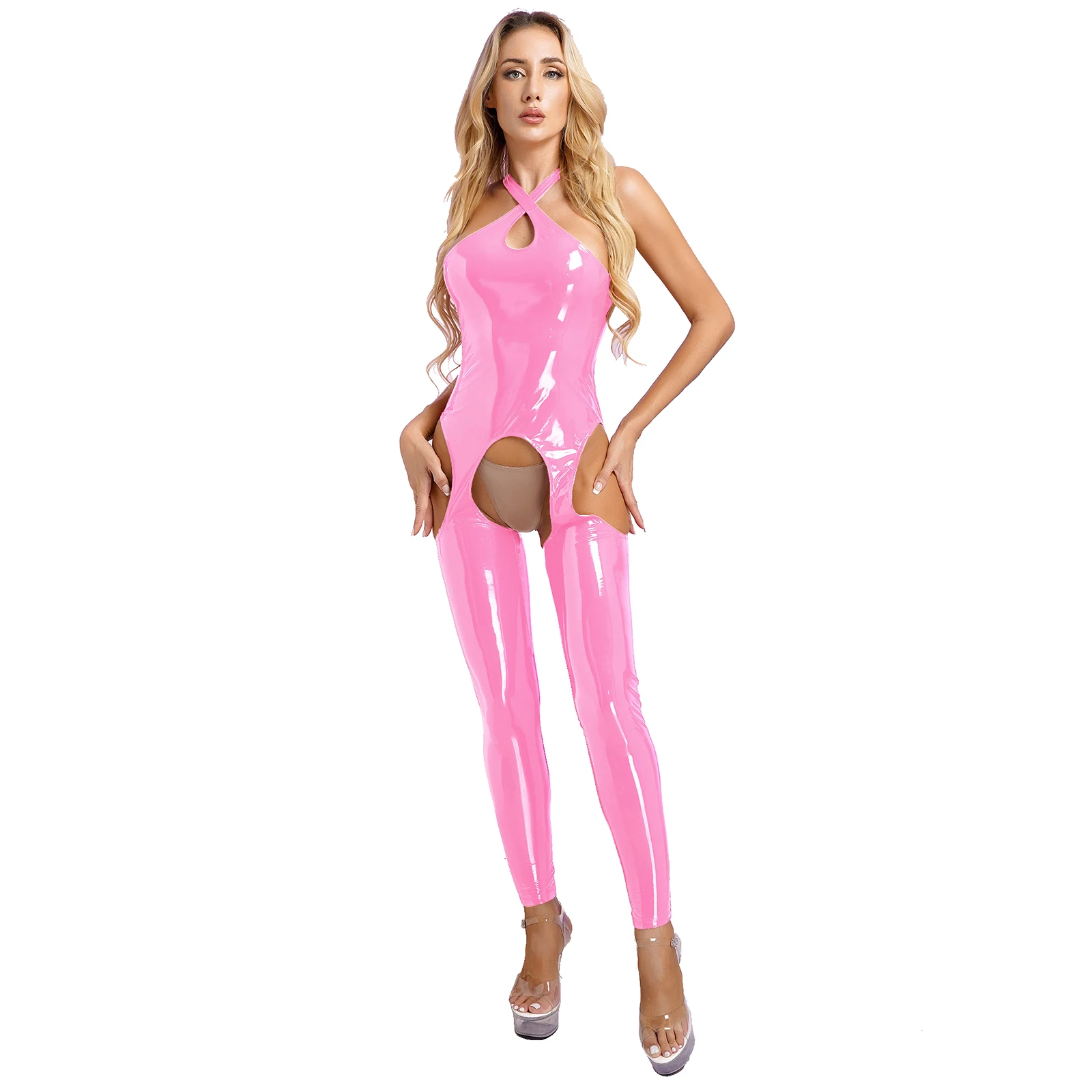 Tag : Womens Sex Latex Catsuit Exotic Lingerie Female Fashion Sleeveless Suspender Stockings Jumpsuit