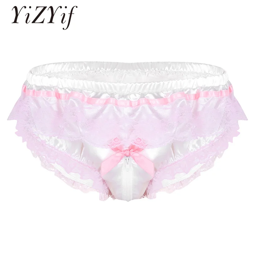 Tag : YiZYiF Sexy Men Underwear Gay Sissy Panties Shiny Soft Satin Ruffled Gay Floral Lace Zipper