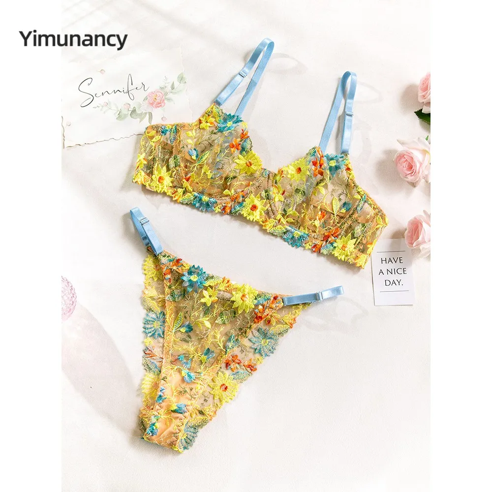 Tag : Yimunancy Floral Embroidery Lingerie Set Women 2 Piece Sexy Sheer Bra Panty Underwear Set