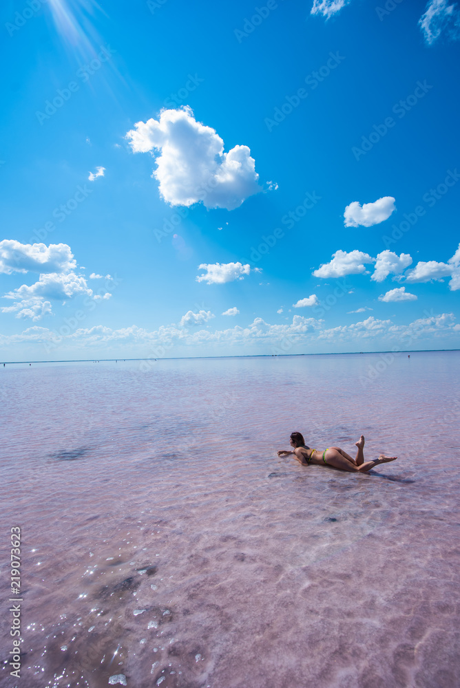 Tag : A Beautiful Woman In A Bikini Is Lying On Her Stomach In A Pink Salt Lake The Red Haired Woman