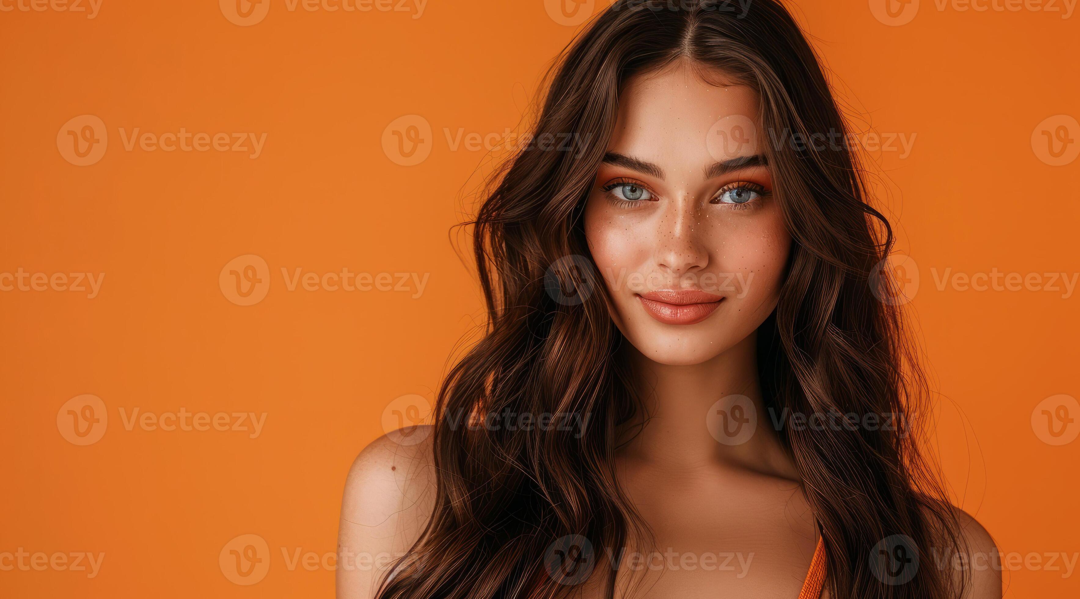 Tag : A Brunette Woman Model With Long Hair Is Standing In Front Of A Orange Background Stock