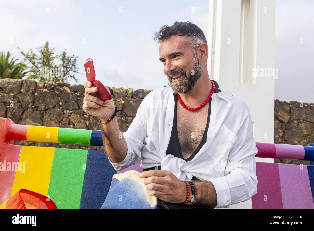 Tag : A Cheerful Transvestite Gay Man Engages With His Hand Mirror Wearing A Stylish White Shirt And
