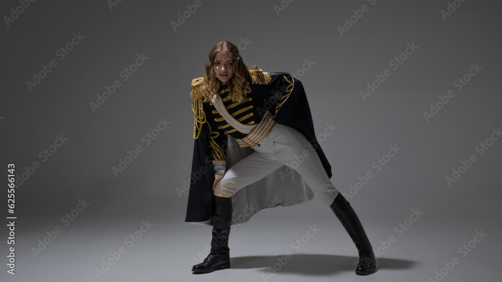 Tag : A Glamorous Blonde In A Carnival Uniform With Epaulettes Posing With Pretentious Poses A Show