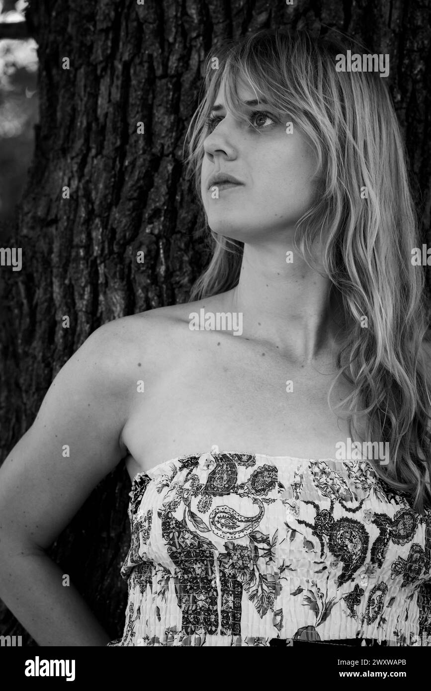 A Grayscale Photo Of A Blonde Girl Leaning Against A Tree Stock Photo Alamy is a popular picture for sexy and hot.