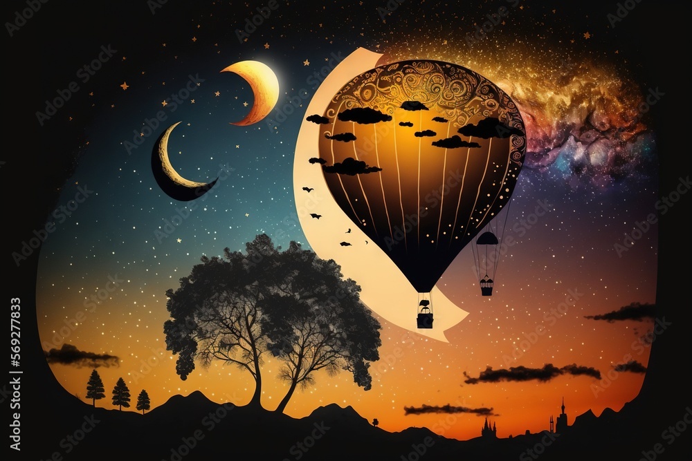 Tag : A Painting Of A Hot Air Balloon Flying In The Night Sky With A Crescent Moon And Stars In The