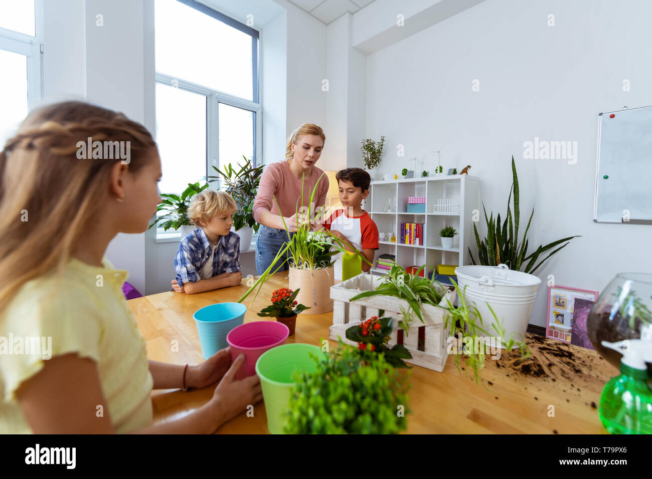 Tag : About Plant Species Blonde Haired Teacher Telling Pupils About Plant Species While Potting Them