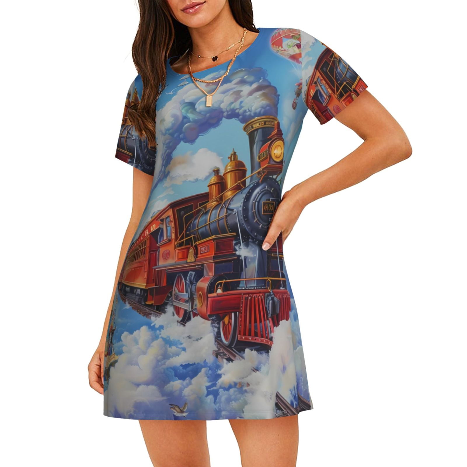 Adobk Cartoon Train Hot Air Balloon Print Womens Short Sleeve Sleepshirt Scoopneck Cute 82476