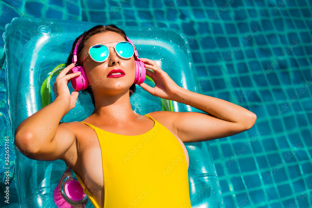 Amazing Beautiful Girl In A Yellow Bikini Air Mattress Swims In The Pool Of A Luxury Hotel 85860