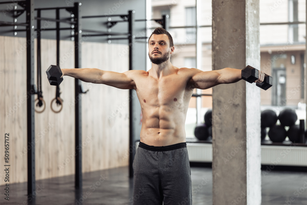 Tag : Athletic Man With A Naked Torso Trains His Shoulders With Dumbbells In His Hands Workout In The