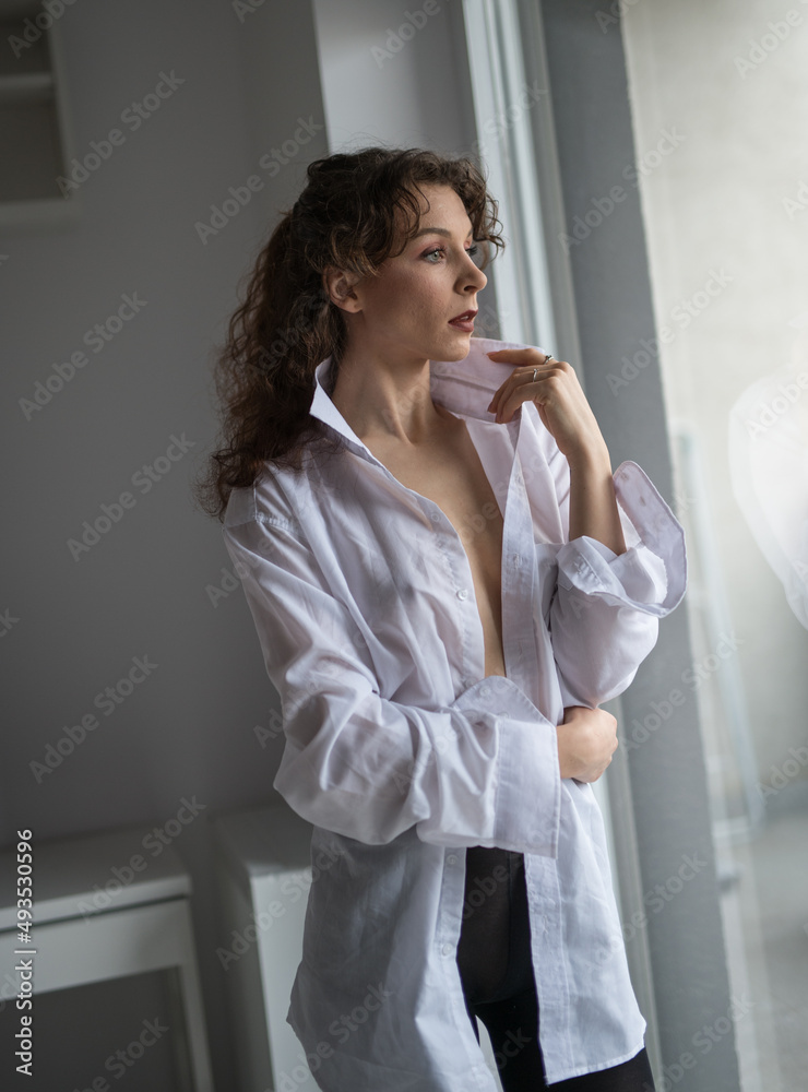 Tag : Attractive Sexy Brunette In White Shirt Posing Provocatively Near A Window Studio Shot