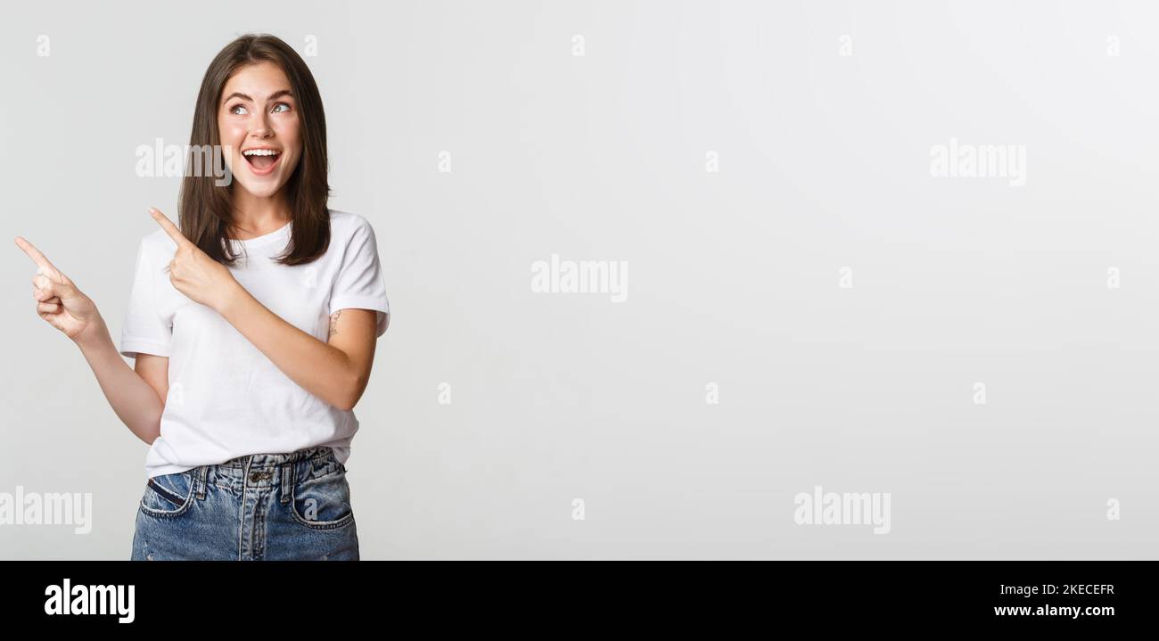 Tag : Attractive Smiling Brunette Girl Pointing Fingers Upper Left Corner Showing Logo Stock Photo