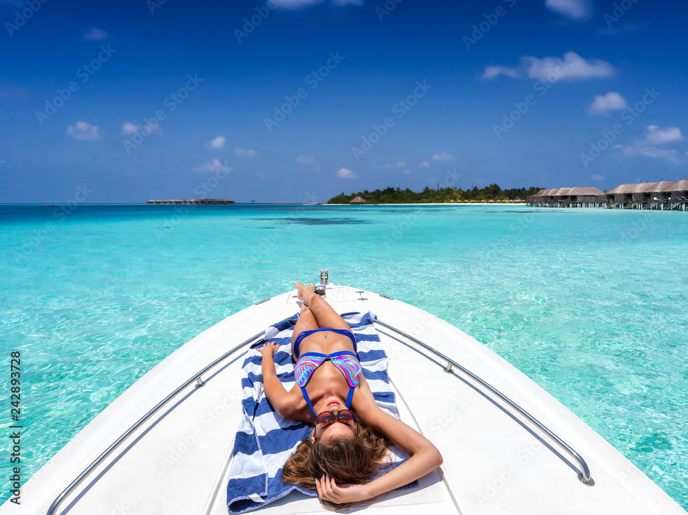 Tag : Attraktive Blonde Frau Im Bikini Liegt Auf Einem Boot Und Sonnt Sich Ber Den T Rkisen