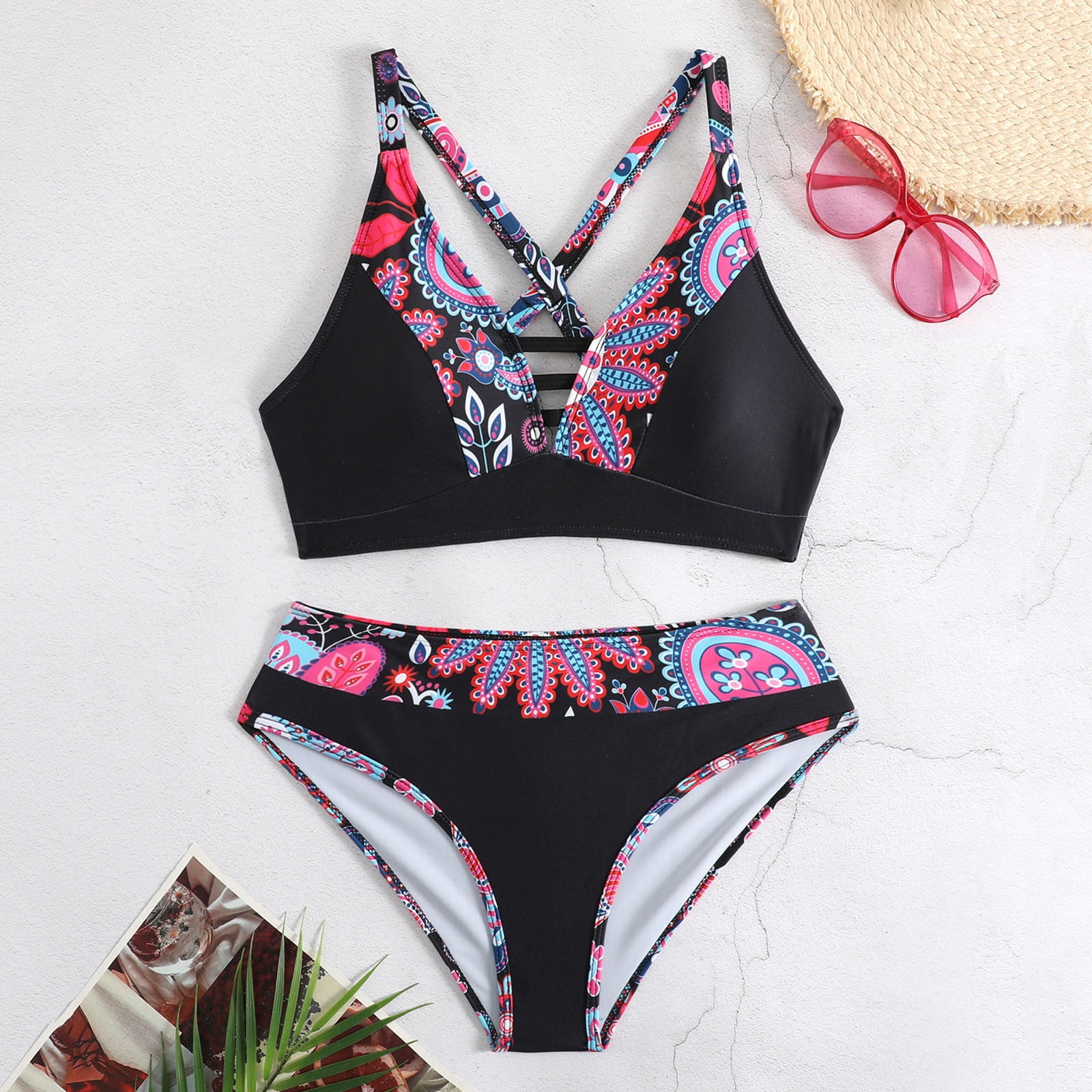 Tag : Ayolanni V Neck Womens Bikini Top Cross Back Separate Pink Boho Two Piece Sets Swimsuit Girls L