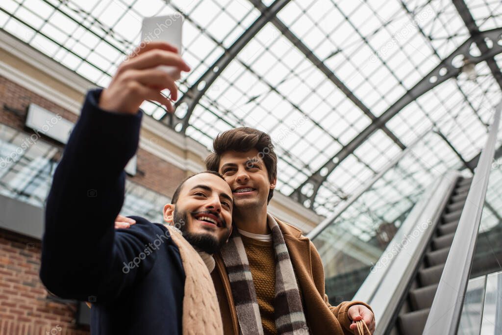 barbudo gay hombre tomando selfie con joven novio en a cuadros bufanda en escaleras mecánicas 2024 is a popular picture for sexy and hot.