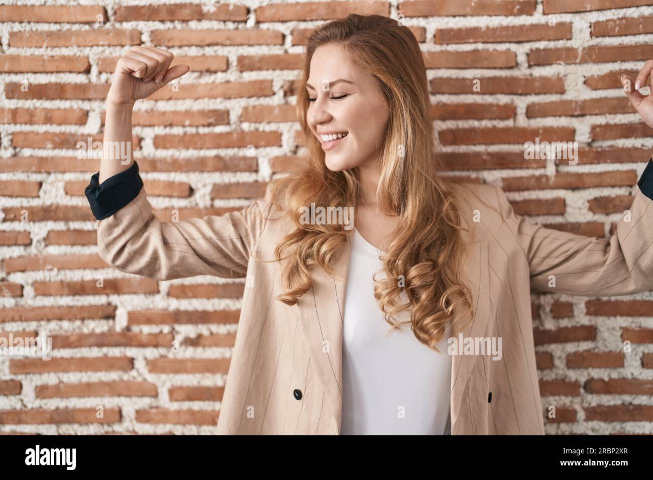 Tag : Beautiful Blonde Woman Standing Over Bricks Wall Showing Arms Muscles Smiling Proud Fitness