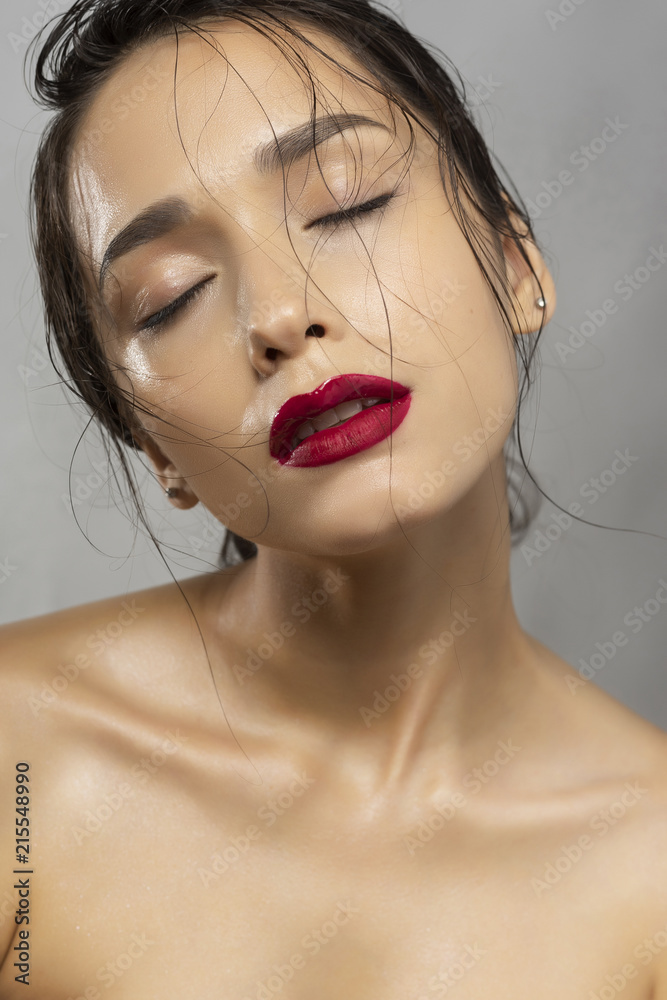 Tag : Beautiful Brunette Girl Fashion Model With Naked Shoulders And Wet Hair On A Gray Background
