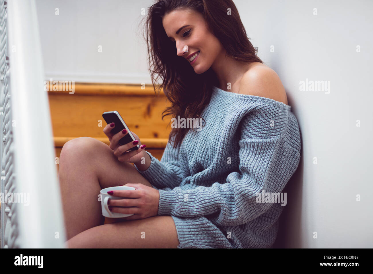 Related pictures for Beautiful Brunette Sitting On Stairs Using Her Smartphone Stock Photo Alamy
