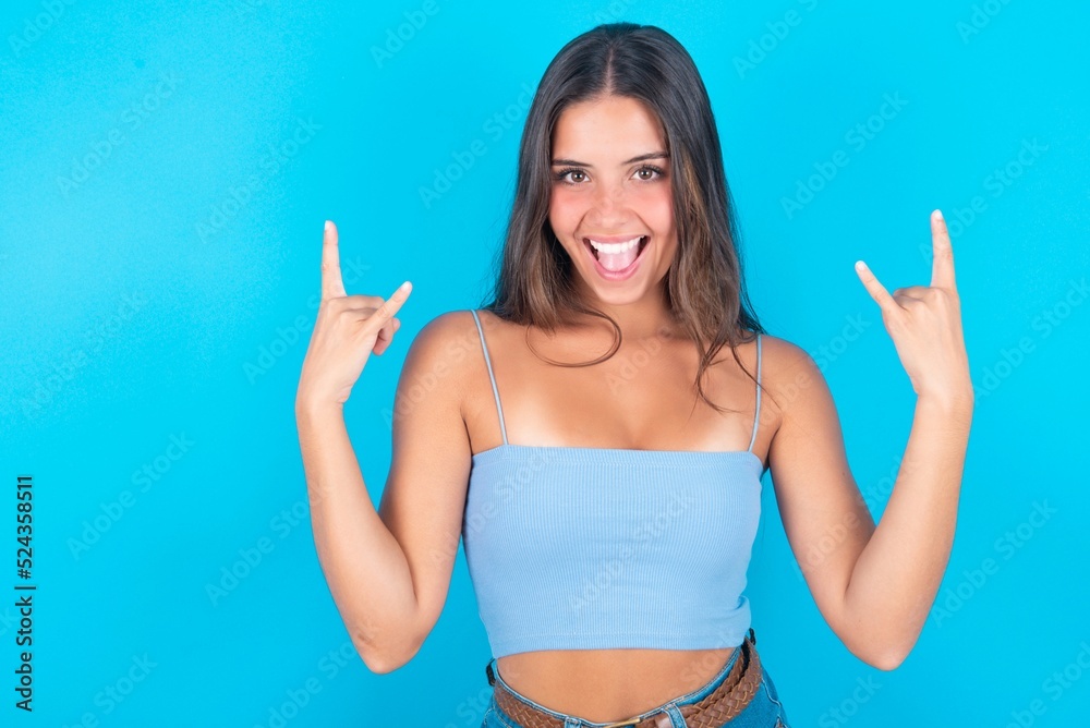 Tag : Beautiful Brunette Woman Wearing Blue Tank Top Over Blue Background Makes Rock N Roll Sign Looks