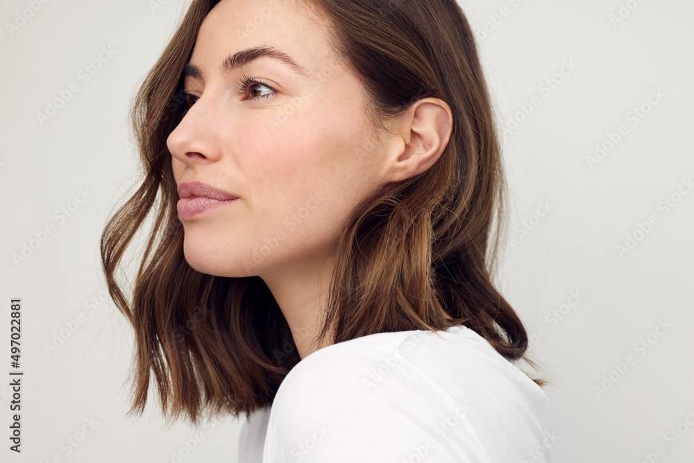 Tag : Beautiful Natural Brunette Woman Smiling And Looking To The Left Close Up Portrait Of