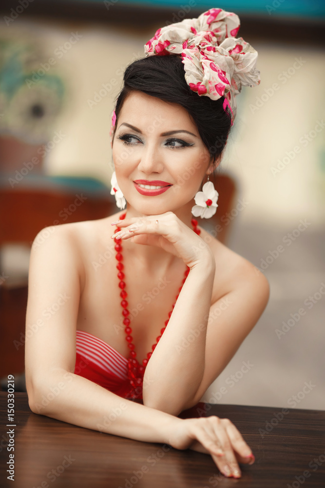 Beautiful Pinap Woman Smiling In Red Bikini Outdoor At Beach Pin Up Girl Retro Style Model In 116436