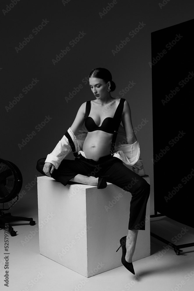 Tag : Beautiful Pregnant Woman In White Shirt Suspenders Brassiere And Trousers Naked Belly