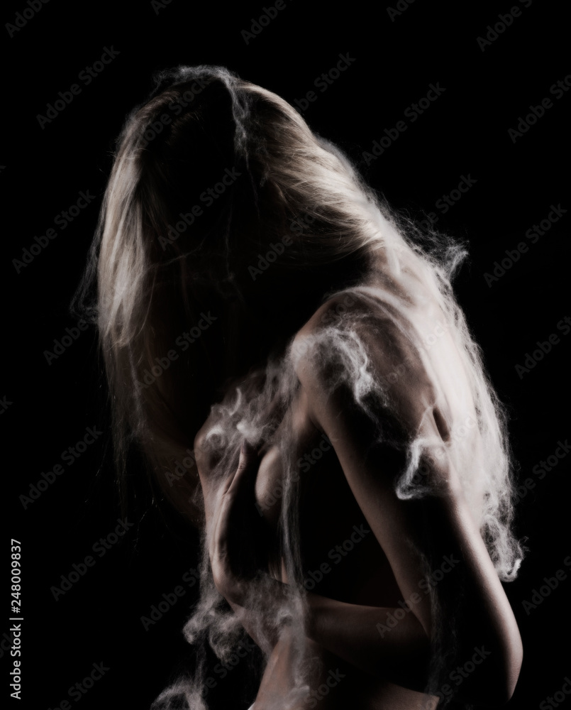 Tag : Beautiful Topless Blonde Girl With Hair Falling On Her Face Stands Sideways Covered With Spider