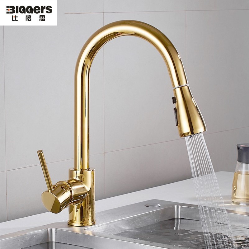 Tag : Biggers Sanitary Gold Plated Pull Down Kitchen Faucet With Function Nozzle Rotatable Cold Hot