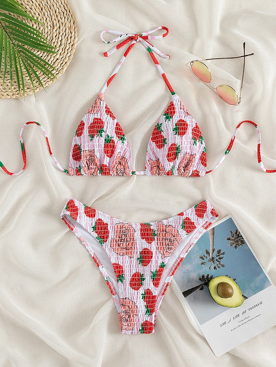 Tag : Bikini Triangular Con Cuello Halter Fruncido Con Impresi N De Flores Y Fresas Aleatorias Moda